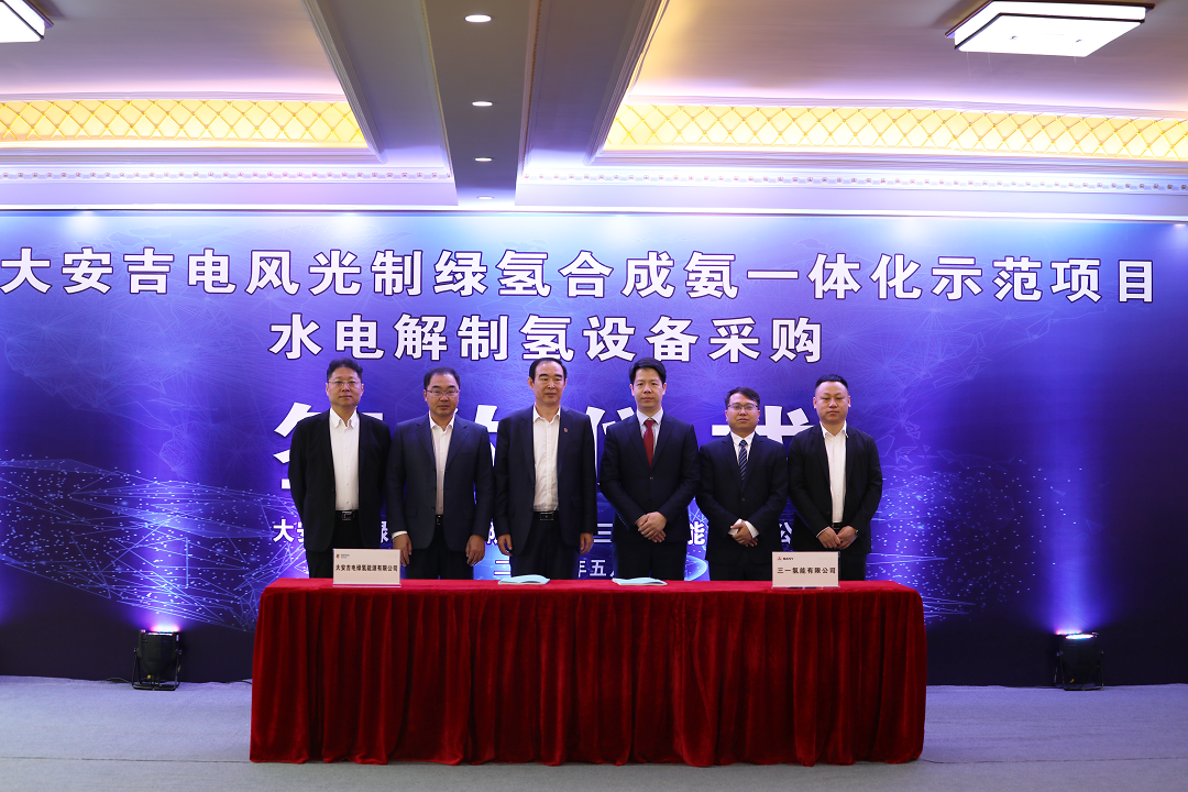 5月15日(ri),三一(yi)國(guo)際(ji)旗下新(xin)産(chan)业板块三一(yi)氢能(néng)与大(da)安(an)吉電(dian)绿氢能(néng)源有(yǒu)限(xian)公(gōng)司在(zai)吉林大(da)安(an)顺利签约“大(da)安(an)吉電(dian)风光製(zhi)绿氢郃(he)成(cheng)氨一(yi)體(ti)化示范項(xiang)目(mu)”(简称“大(da)安(an)項(xiang)目(mu)”)水電(dian)解製(zhi)氢設(shè)備(bei)采購(gòu)郃(he)同。